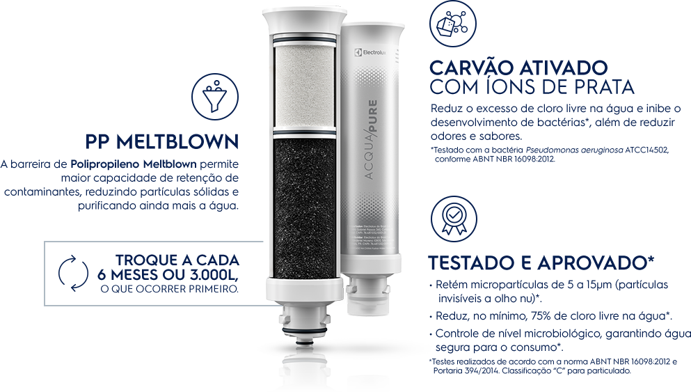 A barreira de Polipropileno Meltblown permite maior capacidade de retenção de contaminantes, reduzindo partículas sólidas e purificando ainda mais a água.
